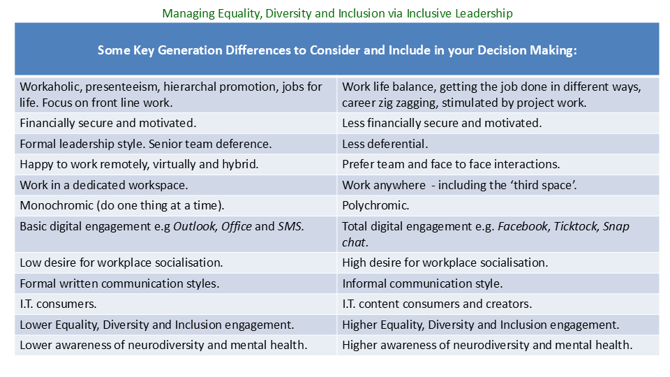 An exploration of Generational Diversity and some of the key considerations for all colleagues in this area. This includes differences in working preferences, expectations of colleagues / leaders and awareness of EDI related considerations.